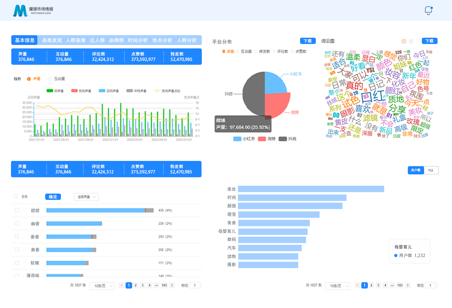 结果展示包含声量互动趋势、情感判断、词云图、平台分布等多维度监测分析,了解用户真实消费需求